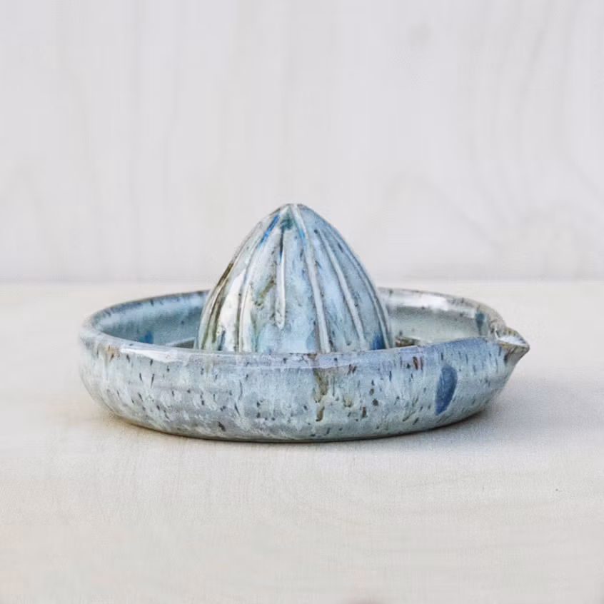 Drejad citruspress i prickig stengodslera med blankvit och blå glasyr.