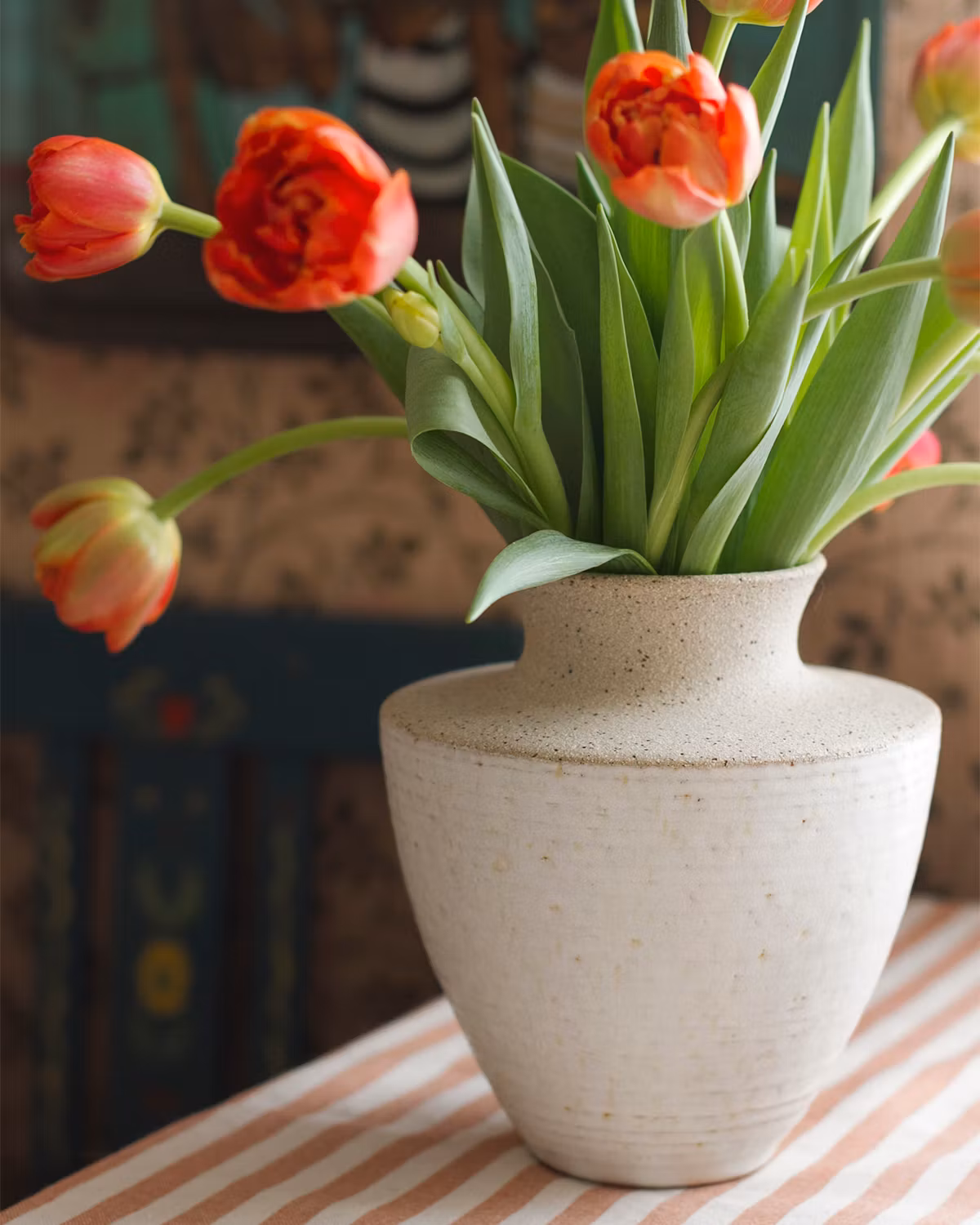 Drejad vas i prickig stengodslera. Delvis doppad i mattvit glasyr.